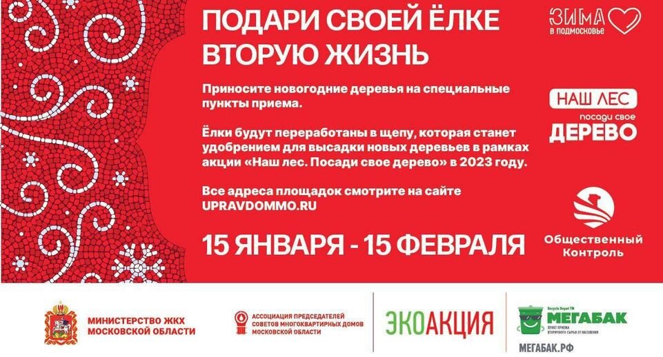 Масштабная акция «Подари своей елке вторую жизнь» пройдет в Подмосковье с 15 января по 15 февраля 2023 года. Жители смогут сдать новогоднее дерево в специализированные пункты приема, откуда сырье отправится на переработку. «Проведение акции позволит увеличить объем отходов для переработки во вторсырье и правильно утилизировать старые новогодние ели. Это также поддержит порядок на контейнерных площадках многоквартирных домов и окажет содействие восстановлению зеленого хвойного фонда Подмосковья», — отметил министр ЖКХ Московской области Антон Велиховский. Еловые ветки отвозят на животноводческие фермы для изготовления кормов, а древесину превращают в щепку, которую используют весной при посадках саженцев. В предыдущие четыре года проведения акции жители Подмосковья сдали в специальные пункты более 100 тысяч елок и сосен, что соответствует примерно 25 гектарам хвойного леса. В этом году на территории региона будут работать около 230 точек приема, которые можно будет узнать по фирменным б
