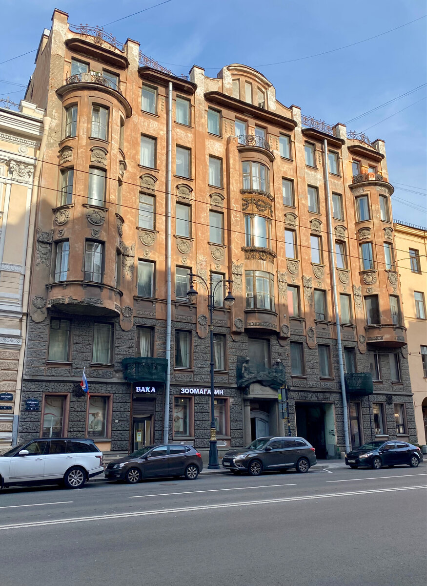 А вот в лицевой парадной Вильгельм Иванович сдерживать свою фантазию уже не стал. Такой размах модернового декора надо было еще поискать. Тут вам и очень буйная лепная растительность, и стильные маскароны, и удивительное лестничное ограждение по индивидуальному эскизу, дорогой лифт, солидные двери солидных квартир…