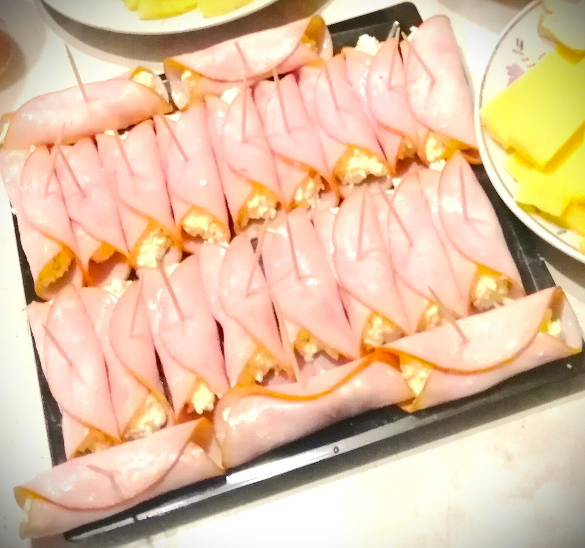 Я очень люблю вкусные, быстрые и очень простые рецепты, надеюсь вы тоже если читаете мою статью. Дело было так: Собрались мы с девочками отдохнуть, посидеть. Сходили в магазин, купили игристого, фруктов, ну и я предложила сделать рулетики( все дружно согласились). Ингредиенты для рулетиков просты: 1. Колбасный сыр гр.300; 2. Ветчина нарезкой; 3. Чеснок по вкусу; 4. Укроп; 5. Майонез; 6. Яйца (хотя бы штучки 3); 7. Соль Вареные яйца и колбасный сыр перетереть на мелкой терке, добавить мелко порезанный укроп, через пресс выдавить чеснок, и все заправить майонезом, хорошо перемешать. Соль по вкусу. В каждый слайс ветчины положить нормально так сырной массы, и завернуть. Мы крепили зубочистками, т.к. забыли купить шпажки декоративные. В общем это просто, дешево и вкусно. Добавляю именно колбасный сыр, т.к. он нежный и несет нотки копчености. Если добавить другой сыр (например российский), то начинка будет горчить и никакого наслаждения от еды не будет (проверенно). С плавленым тоже не оче