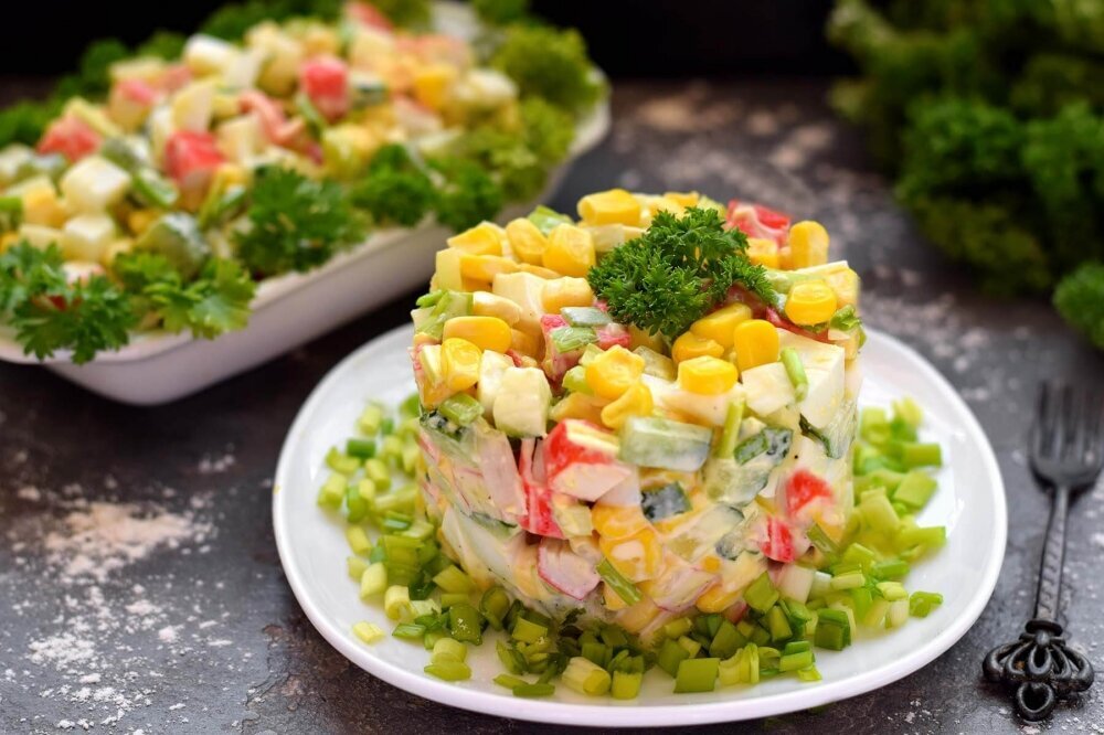 Салаты из крабовых палочек всегда занимали почетное место на праздничных столах. Они легкие, низкокалорийные, яркие и ароматные. Предлагаем наиболее простой вариант этого салата с удачно подобранным ингредиентным составом. Свежие огурчики и кукуруза отлично дополняют крабовые палочки и яйца. В качестве зелени идеально подойдет зеленый лук. Такой салат можно заправить, как майонезом, так и сметаной. Также можно использовать разные варианты его подачи на стол. Ингредиенты: Приготовление: Приготовьте все необходимые продукты для приготовления салата. Яйца предварительно сварите вкрутую. Время варки составляет 8-10 минут с момента кипения жидкости. Яйца охладите, очистите, нарежьте кубиками среднего размера. Крабовые палочки заранее разморозьте, очистите. Каждую палочку разрежьте вдоль на две части, после настрогайте кубиками. Крабовые палочки вместе с яйцами сгрузите в глубокую емкость. Свежие огурцы ополосните, высушите, нарежьте таким же образом, как и предыдущие ингредиенты. Кукурузу