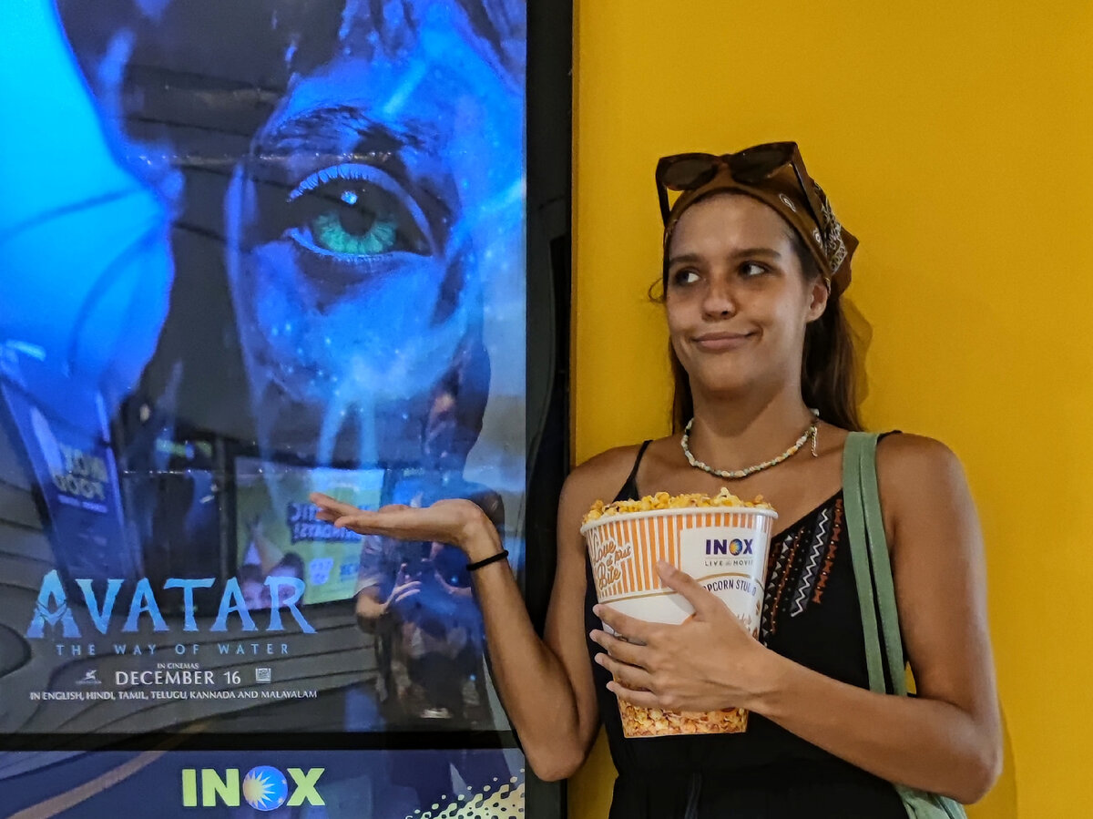 Встали в 7:00, чтобы 2 часа потрястись в автобусе из Арамболя до ближайшего кинотеатра и наконец посмотреть второго Аватара в индийском 3D. Дабы познать «Путь воды», нужно сначала проделать тернистый путь по дорогам Гоа. Но и сам индийский кинотеатр удивил не меньше, чем картина. Вот какие детали привлекли внимание. Возле каждого зала – кулер с водичкой и стаканы, мелочь вроде, а нравится, в российских не встречала пока такого жеста заботы. Цена билета на дневной 3D-сеанс в будни = 175 ₽ (помню такие цены на моем первом курсе универа). В выходные – 270 ₽, что тоже хорошо. Перед началом в порядке вещей смотрим рекламу, и тут на экране загорается изображение национального флага, все встают, и включается индийский гимн. Послушали, поизумлялись такой необычной практике, все сели, начинается фильм. Спустя полтора часа прямо посередине сюжета внезапно выключается экран, сидим в полной темноте. Затем врубается свет, все начинают расходиться. Мы отогнали мысль о том, что вторая половина филь