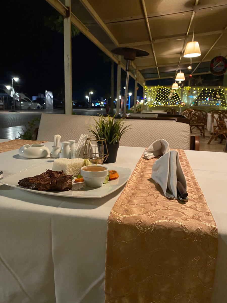 В прошлый раз я рассказала о свиданиях с арабским миллионером по имени Т. Мы вышли из отеля и понеслись по трассе вдоль ночной пустыни, мимо редких огней дорогих отелей. Каких-то 15 минут и мы оказались перед воротами Марина Хургада, центральная набережная с причалом для яхт. -Ты когда-нибудь пробовала верблюжий стейк? -Нет...не знала, что верблюдов едят. -Хочешь попробовать? Я сейчас закажу -Но уже час ночи, все рестораны закрыты... -Я сейчас позвоню, для нас откроют. Один звонок и охранник действительно открыл ворота, и мы заехали на набережную, которая была уже закрыта для посетителей к тому часу. Пустынная улица, яхты, закрытые темные кафе. И тут я увидела горящий свет и одиноко накрытый стол в одном из ресторанов - Heaven. Наш стол: На столе меня ждал стейк, вино и гарнир в форме сердца: По вкусу верблюжье мясо похоже на говядину, но слаще. Я люблю пробовать новые блюда, поэтому с удовольствием согласилась на эту авантюру. За ужином мы разговорились о людях с экстрасенсорными спо