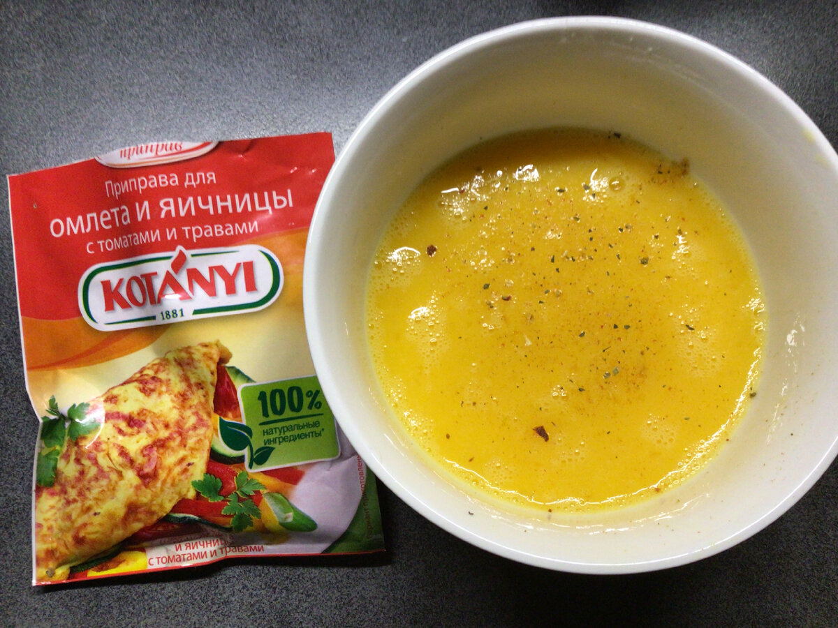 В миску разбиваем яйца, посолили, добавили специи для яичницы и всё хорошо венчиком взбиваем.
