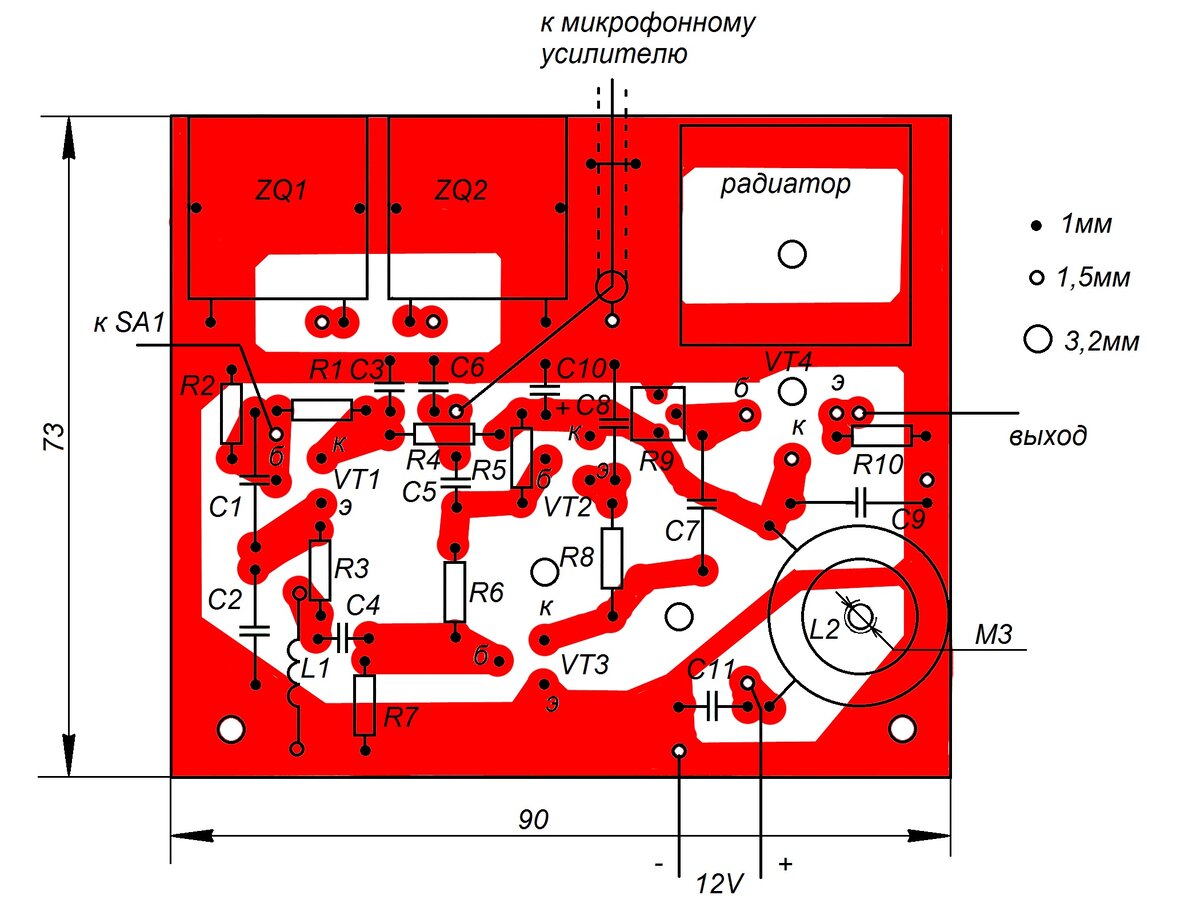 Достоинством схемы эмиттерного повторителя в выходном каскаде является то, что коллектор транзистора, с которым соединен большой массивный радиатор, оказывается "холодным" - т.е. на нем нет ВЧ сигнала. Емкость между радиатором и общим проводом оказывается даже полезной, так как добавляется к емкости блокировочных конденсаторов по питанию. Но не слишком расслабляйтесь: на радиаторе - полное напряжение питания. Так что замыкание между ним и шасси аппарата или общим проводом вызовет КЗ источника питания и выжжет дроссель L2. Поэтому, например, экранированный провод к предварительному (микрофонному) усилителю прихвачен хомутиком из проволоки, впаянной в отверстия платы.