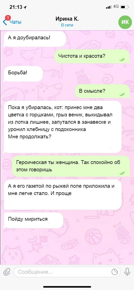 Уборка дома - дело долгое по времени, но не долгосрочное по эффекту. Вроде только уберешься - и тут же попугай своей едой пуляется... Или сама же что-то как рассыплешь... споткнувшись о кота. Сегодня для Вас переписки именно о том, как питомцы помогают нам убираться. Вот такой конфликт интересов. А котик так старался помочь... Вот еще одна переписка. Теперь уже о двух спаниелях в качестве помощников. Вот такое решение проблемы. Я знаю, что очень некрасиво пугать собак пылесосом... но иногда очень хочется. Еще одна переписка - про кота. Читаем. Вот такая сильная любовь! И напоследок переписка о том, что убираться надо с телефоном в кармане. Так спокойнее. Через 20 минут жену пошел искать - это вполне хороший муж, кстати. ----- Улыбайтесь каждый день! И читайте также: Здоровья Вам и Вашим питомцам! Спасибо за внимание к каналу "СобачьЯ жизнь"! #юмор #истории из жизни #кошки #собаки #смешные смс переписки