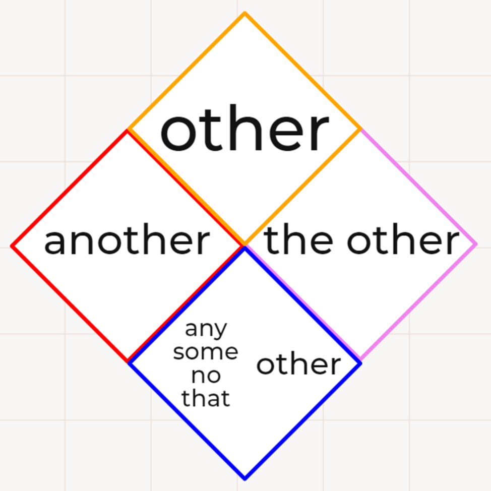 Во многих учебниках разделение этих понятий весьма простое - other используется с неисчисляемыми существительными и с исчисляемыми существительными множественного числа, another – с исчисляемыми существительными единственного числа. Как оказалось все несколько сложнее, давайте разбираться. Other используется в значении «другой», «другие», «еще одни» перед: 1) существительными во множественном числе: Mr Harris and Mrs Bate and three other teachers were there. 2) неисчисляемыми существительными: I can't see you now— other time, maybe. 3) с исчисляемым существительным в единственном числе, c еще одним определителем, например: that, some, any, no, many, only: There seem to be no other survivors. 4) С определенным артиклем The other + существительное в единственном числе значит «второй из двух, противоположный». I work on the other side of town. 5) The other + существительное во множественном числе значит «остальные», «оставшиеся из группы». I'll wear my other shoes—these are di