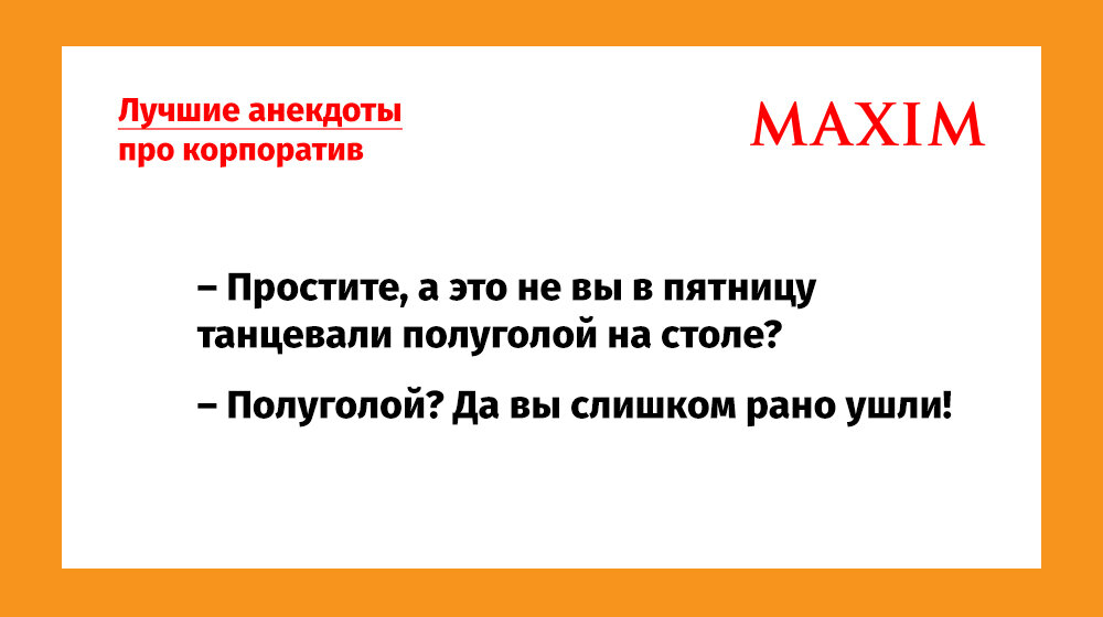 Желательно прочитать их до корпоратива, а не после. Будет не так больно и даже смешно. — Привет, можно вопрос?— Спрашивай.— Можно я на корпоратив с женой приду?— Нет, праздник только для сотрудников.— Ура, отлично! Приближается Новый год, и будут новые герои корпоратива, а о вас, прошлогодних, наконец-то забудут. Осталось ждать недолго. — Ты чего такой нарядный?— Пир во время чумы.— Новогодний корпоратив?— Да. Молодой бухгалтер Ольга Витальевна надела на корпоратив платье с таким откровенным декольте, что в танце вывалилась из него целиком. — Возвращаюсь я как-то с корпоратива, и вдруг сзади крики: «Стоять! Стоять!!!»— Ну а ты что?— Какое там стоять! Я и полз-то с большим трудом… После корпоратива:— А вы во сколько разошлись?— Разошлась я ближе к двенадцати, а ушла в два часа… После корпоратива жена звонит мужу:— Дорогой, я домой не могу доехать, приезжай за мной, забери!— Хорошо. А тебя откуда забрать?— Я на первом этаже, возле лифта… В моем городе я единственный работник компании. Мо