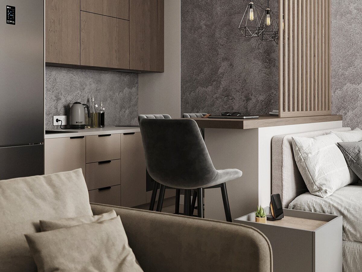 — В этой зоне использованы акцентные обои темно-серого цвета под бетон. Они визуально отделяют кровать от дивана, но в то же время объединяют ее с зоной кухни. За счет реек-разграничителей мы получаем тот самый эффект зонирования единого по стилистике пространства.