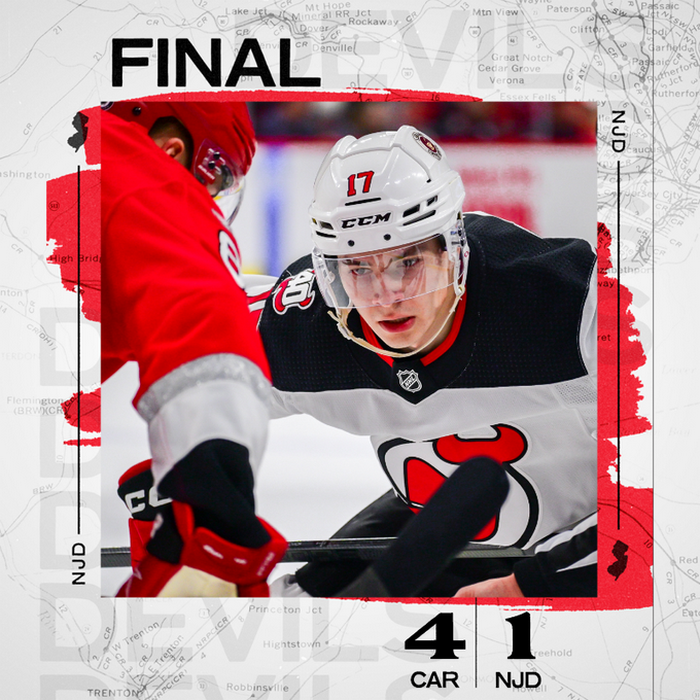 В регулярном чемпионате НХЛ "Нью-Джерси" уступил на выезде "Каролине". Для "Нью-Джерси" это уже шестое поражение подряд. Для "Каролины" — шестая кряду победа. Набрав 46 очков, "ураганы" опередили "дьяволов" (44) и возглавили таблицу Столичного дивизиона. Белорусский нападающий "Нью-Джерси" Егор Шарангович провел на льду 13 минут 36 секунд, в створ не бросал, завершил вечер с показателем полезности 0, записал в актив один силовой прием и заблокировал один бросок соперников. Всего в чемпионате у него 15 (8+7) очков и -3 по "+/-" в 32 проведенных матчах. НХЛ. Регулярный чемпионат Каролина — Нью-Джерси — 4:1 (1:0, 2:0, 1:1) Шайбы: 1:0 — Котканиеми (4) (Джарвис, де Хаан, 0.20). 2:0 — Д.Стаал (9) (Мартинук, Славин, 24.17). 3:0 — Терявяйнен (2) (Славин, Фаст, 26.21-мен.). 3:1 — Д.Хьюз (17) (Брендан Смит, Братт, 55.24). 4:1 — Носен (6) (56.46).