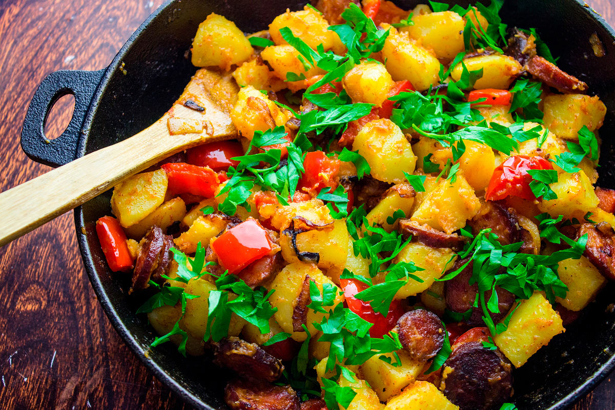Иногда совсем нет времени на приготовление сложных блюд. Хочется прибежать с работы, закинуть в емкость продукты, которые есть, и чтобы все получилось вкусно. Микроволновка в этом случае — лучшая помощница: нарезал все, забросил в нее, родимую, — и, пока крутится-вертится, можно передохнуть. Картофель лук колбасные изделия (сосиски или вареная колбаса) любимые пряности зелень (петрушка, укроп, лук) растительное масло майонез соль перец — по вкусу. Приготовление: