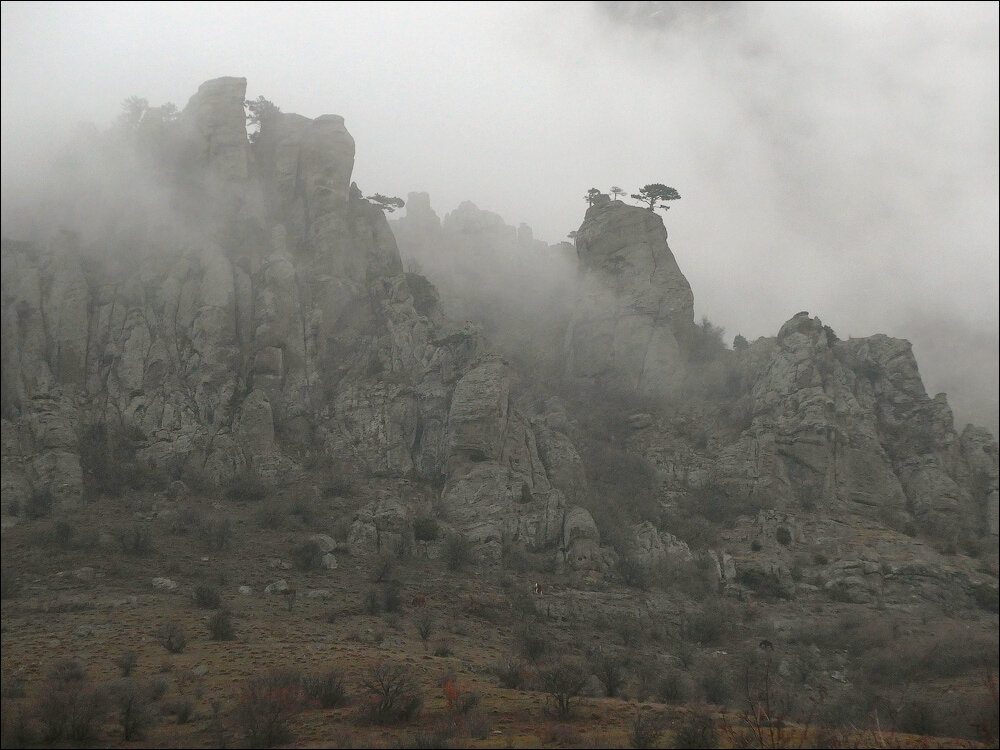 Пройдя накануне весь массив Демерджи с юга на север и с трудом выбравшись из Курлюк-Баша, на следующее утро мы не придумали ничего лучше, как снова отправиться на Демерджи. Собственно, для этого мы и приехали в новогодний Крым — ловить в горах сказочные красоты. Не в море же купаться… Утро снова начинается с автобуса до Лучистого. Но сегодня мы пойдём наверх самым популярным маршрутом — через Долину Привидений. Пасмурно. Солнышко мы видели лишь однажды — да и то отражённым в море. Над горизонтом висела граница облачности, и в море от невидимого солнца сияла ярко-оранжевая дорожка... Теперь, у подножия Демерджи, от этих красок нет и следа. Зато ползут по причудливым скалам облака в лучших традициях китайской акварели. Призраки Демерджи то проступают силуэтами из туманного марева, то опять растворяются — и тогда в видимость выпадают уже другие очертания и фигуры, и так — без конца. И висит над долиной под Бабуганом огромное, длинное, белое облако. Знак того, что дню не бывать ясным. Где-