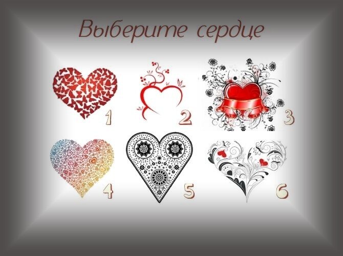 Тест: узнайте степень своей эмоциональности Можете ли вы контролировать свои чувства или ваша реакция мгновенна? Вы хотите узнать степень вашей эмоциональности? (ваше бессознательное). Пройдите тест, разработанный психоаналитиком доктором А. Сепе, чтобы выяснить это. Каждое сердце, которое вы видите на иллюстрации, имеет отношение к вашей эмоциональной индивидуальности. Выберите изображение, которое привлекает ваше внимание, затем ознакомьтесь с результатами. Предупреждение: ваша сознательная часть может с трудом принять это! РЕЗУЛЬТАТЫ Рисунок 1 / Очень высокая эмоциональность В романтических или дружеских отношениях проявляется сильная аффективная нехватка; фактически, вы предполагаете идеальное поведение, которое хотели бы от своих родителей. Это не значит, что вы не умеете любить, наоборот, вы слишком много отдаете себя, любите доставлять удовольствие, чтобы избежать разочарований. Рисунок 2 / Высокая эмоциональность В сентиментальных и социальных отношениях игру ведете вы; вы бере