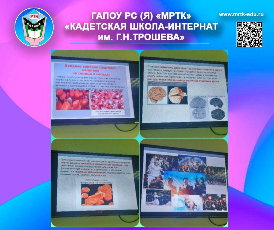 20 декабря 2022 г. в ГАПОУ РС (Я) «МРТК» филиале «Кадетская школа-интернат им. Г.Н. Трошева» в рамках профилактики употребления алкоголя прошла трансляция видеопрезентации "Алкоголь - это яд".