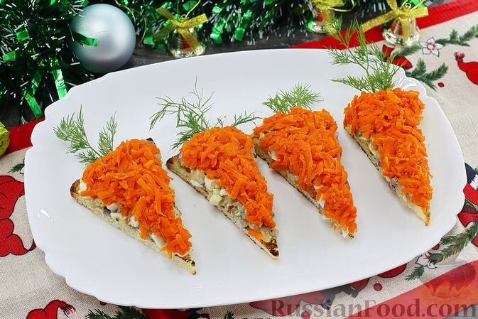 Бутерброды с морковью и сельдью. Слоёный салат с куриной печенью и овощами. Отбивные из куриных голеней, запечённые под шубкой. Жареная картошка в соевом соусе. Дрожжевые булочки "Кролики". Слоёный салат с куриной печенью, картофелем, морковью и маринованными огурцами.Все продукты прекрасно сочетаются по вкусу. Нежная куриная печень и яйца придают салату сытность, тушеная морковь с луком — приятную сладость, а маринованные огурчики — кислинку. Запечённые отбивные из куриных голеней с помидорами и сыром. С разделыванием голеней придётся немножко повозиться, но оно того стоит. Отбивные, запечённые под сырно-помидорной шубкой, получаются сочными и очень вкусными. Такие куриные отбивные вполне достойны занимать почётное место на праздничном столе. Жареная картошка в соевом соусе. С помощью соевого соуса, сахара и кунжута простая жареная картошка может стать оригинальным блюдом. Сочетание солёного и сладкого, популярное в азиатской кухне, делает вкус картофеля более насыщенным, с еле улови