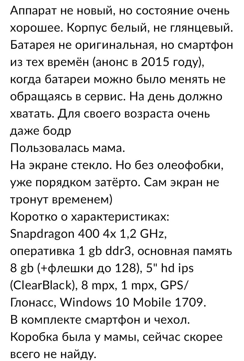 Приветствую 🙌 Знаю, что отправлять технику авито-доставкой рискованно, но решила попробовать. Не знаю, всё ли пройдет гладко, но даже при самом плохом раскладе я потеряю тысячу и приобрету опыт. Продаю дочкин старенький телефон, который не поддерживает интересные игрушки и службы вроде whatsapp и telegram. То есть это уже такой динозавр, который лишь бы сплавить и хоть что-то выручить. Стала искать, сколько за него хотят, ну 1500 примерно, только за эту цену уже давно висит. А вот молодой человек аж 2000 хочет и настрочил прям целую поэму. Не знаю, как вас, но меня пугают продавцы, который сочиняют целые трактаты к старому копеечному аппарату 👇😁 И это всё о простеньком Lumia, я его выставила за 1000, но особо чудес не ждала. Телефон висел полтора месяца. По нему писали, рабочий ли, можно ли на нем хоть во что-то играть, но дальше разговоров дело не шло. Поэтому когда нарисовался реальный покупатель и попросил авито-доставку 🚙, решила не отказывать. Лучше какие-то деньги, чем вообщ