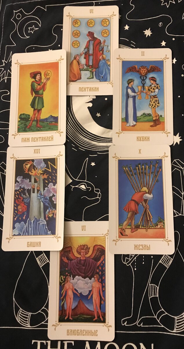 Посмотрим на Ваши отношения, что сейчас и чего ожидать в будущем сам расклад: « шестерка пентаклей» С вашим партнером у вас уже сложившиеся отношения, все притирки позади, вы знаете о партнёре всё, изучили все привычки и не достатки. Данные отношения сложившиеся, крепкие, построенные на доверии и понимании партнёра, такие отношения за пару месяцев не складываются. «паж пентаклей» и « кубки» сейчас вы получаете новые знания, знакомства, так же и ваши отношения эволюционируют. ваши отношения стали более яркими, страстными, как второе дыхание открылось. может, вы стали чаще выходить в свет вдвоём, как то разнообразили свою жизнь, внесли красок, отсюда и новые знакомства и Новый взгляд на отношения и появление новой, забытой, утихшей страсти. Далее «башня» и «10 жезлов» обе карты негативные, означают разрешение, разлад, окончание чего то.... Так, что будьте готовы к серьезным испытаниям, они впереди. Так же, может просматриваться, измена одного из партнеров. И на сколько бы стабильны, кре