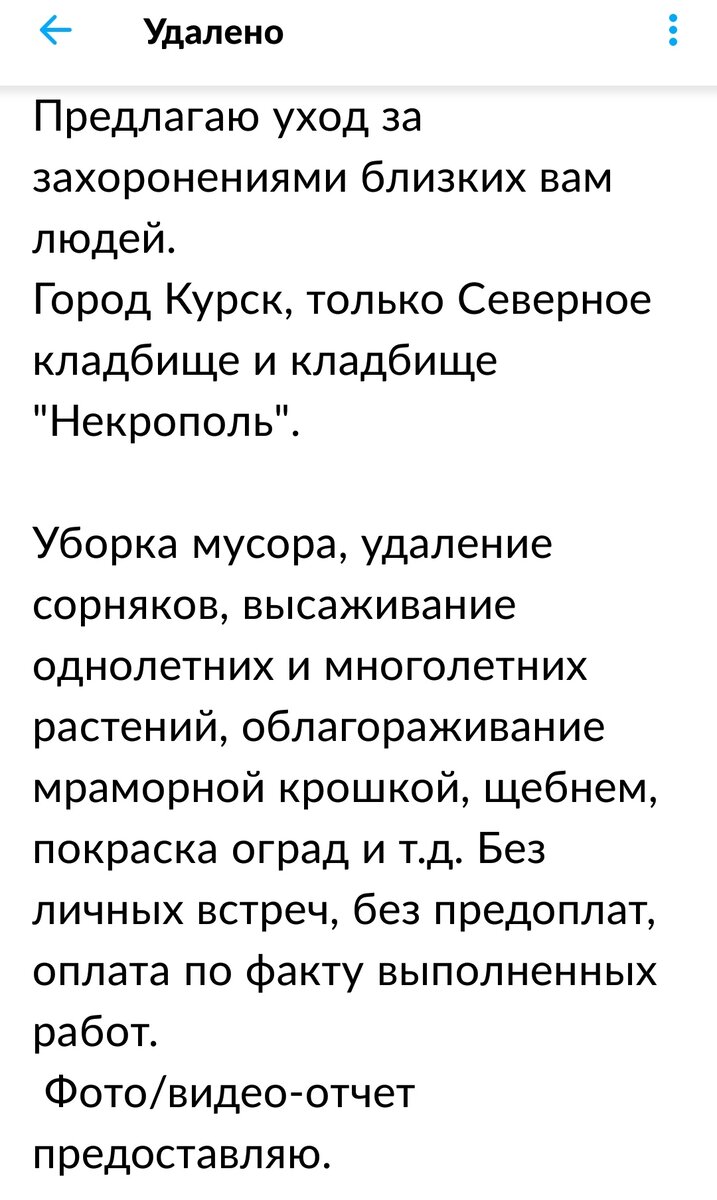 Рассказ о том, как учат не очень умных людей — это я про себя. Весной этого года выставила я объявление на "Авито". С предложением услуг по уборке могил. Бывает же такое, что некому приехать убраться. Или живут далеко, или приболел человек. А душа-то болит у родственников. Ну, как мне кажется — должна болеть. Определилась для себя, что сумма будет минимальная — время-то сейчас не такое, чтобы люди шиковали. Да и потом — наверняка попросят о помощи пожилые люди — откуда у них-то миллионы. Выставила объявление и, как часто это бывает — смотрят, в избранное добавляют, но никто не обращается. Я и позабыла о нем. И вот летом — сообщение. Съездила я, посмотрела. Запущено, конечно, очень сильно. Лет тридцать никто не ходил. Ну, мало ли — может, уехали люди за несколько тысяч километров. Определились, что надо сделать — отмыть памятник, от плесени и грибка очистить, сорняки, да корни деревьев выкорчевать, земли купить. Покрасить обрамление. Конечно, по-хорошему надо всё переделать, но, мо