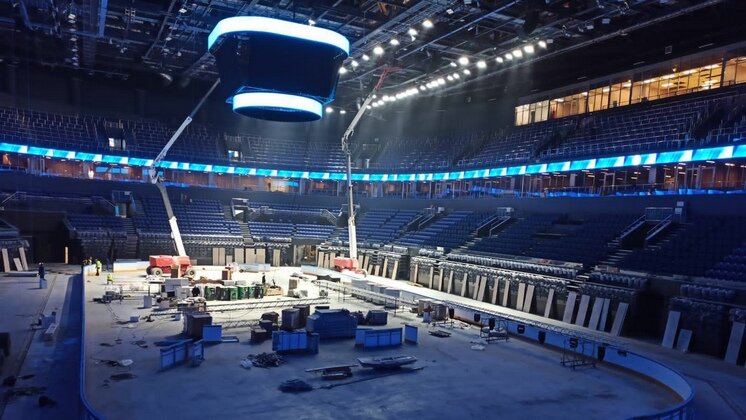 Огромный медиа-куб подняли на высоту и смонтировали в новой ледовой арене Новосибирска