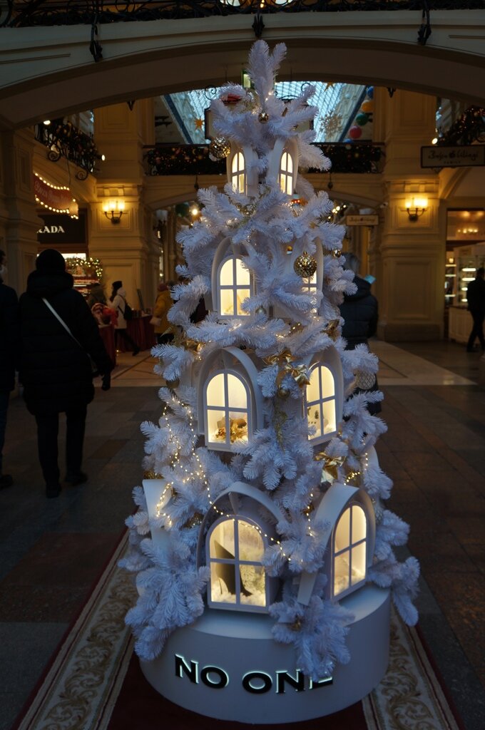 У меня становится традицией в преддверии Нового года отправяться в ГУМ. Настроение поднять, да на еочки поюбоваться. После весеннего исхода некоторых компаний из России, я думала, что елочек в Гуме же не будет. Ведь основную "тусовку" составляли именно елочки зарубежных компаний. Но нет... Елочек быо достаточно, хотя и меньше обычного. Некоторые компании особо не усердствовали и повторили свой прошлогодний успех вариант. Например, компания NO ONE и Кафе Пушкин. Прошлогодние елочки. А здесь елочки этого года. Разве что Щелкунчики другие. Из того что понравилось... Елочка от компании Simone Pérèle, которая создает практичное и комфортное нижнее белье. Следующая - елочка от Кинозала №1. Она, кроме шариков, украшена кинолентой с кадрами любимых советских фильмов. Елка с морковкой, капустой и большим семейством кроликов (зайцев). Следующий год ведь год кролика. Совершенно очаровательная елка от программы "Спокойной ночи, малыши". Елка от компании "Twinset". Она на фотографии вторая. Е