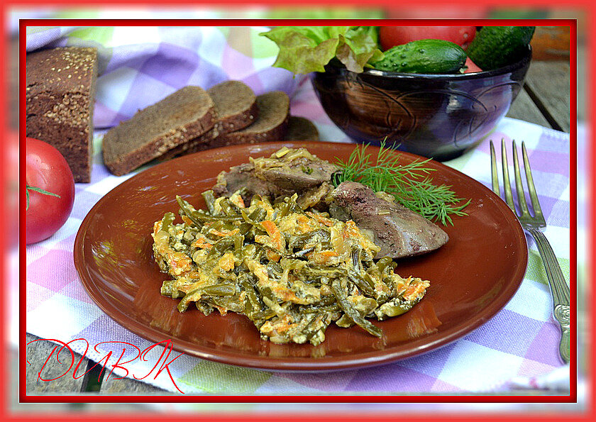 Добавить стрелки, сметану, посолить и тушить еще 5 минут, помешивая.
