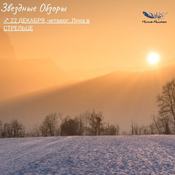 Доброго утра четверга! ♐ 22 ДЕКАБРЯ, четверг. Луна в СТРЕЛЬЦЕ Тренды дня: Мы проснемся этим утром вместе с рождением Нового Солнца. Настал день для того, чтобы прописать свои цели на год. Солнце переходит в знак Козерога в 00:48 и открывает месяц, который связан с построением новых планов и внедрением новых идей в жизнь, реализацией мыслей в материальном мире. А 29 Лунный день способствует избавлению от чего-то, а энергия дня Зимнего Солнцестояния – планированию долгосрочному. Поэтому все еще держим в уме от чему скажем НЕТ и держим фокус на то, чем это нет готовы заменить. Этот день больше подойдет для подведения итогов, чем для начала чего-то нового, так как это последний день лунного месяца: энергия на низком уровне, поэтому сил для активного продолжения дела у вас может не хватить в будущем. Луна в Стрельце обычно дает оптимизм и веру в лучшее, а гармоничный транзит Луны и Сатурна поможет упорядочить мысли и успокоит эмоции. Хороший день для анализа прошлого. Из аспектов дня: Сол