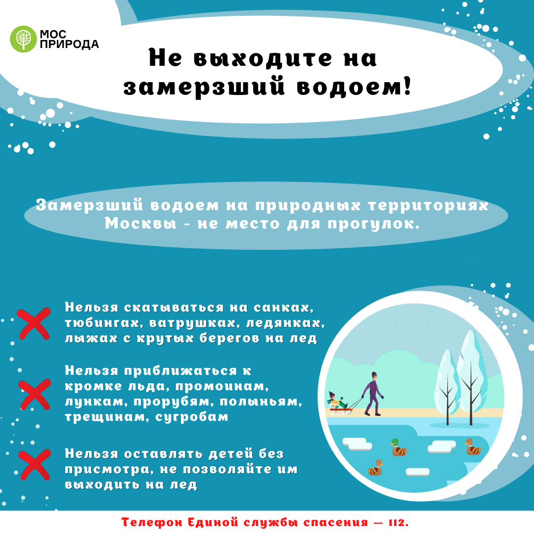 ❄️ Первое и главное правило: без необходимости не выходить на лед. 😄 Специалисты Мосприроды напоминают: нельзя выходить на лед. Толщина льда на водоеме не везде одинакова. Тоньше всего он у берегов, на изгибах, излучинах, около вмерзших предметов, подземных источников, в местах слива в водоемы теплых вод. ❗️Чрезвычайно опасным и ненадежным является лед под снегом и сугробами. Опасность представляют собой полыньи, проруби, трещины, лунки, которые покрыты тонким слоем льда: он может проломиться. Ни в коем случае не проверяйте прочность льда ударом ноги. 🍂Осенью для предупреждения несчастных случаев летние информационные щиты «Купаться запрещено!» заменили на зимние – «Выход на лед запрещен!». Всего по берегам 60 водоемов установлено 317 знаков безопасности. Они расположены так, чтобы их было видно с любой точки берега. 🌨Будьте осторожны: ▫️ Не скатывайтесь на санках, тюбингах, ватрушках, ледянках, лыжах с крутых берегов на лед; ▫️ Не приближайтесь к кромке льда, промоинам, лункам