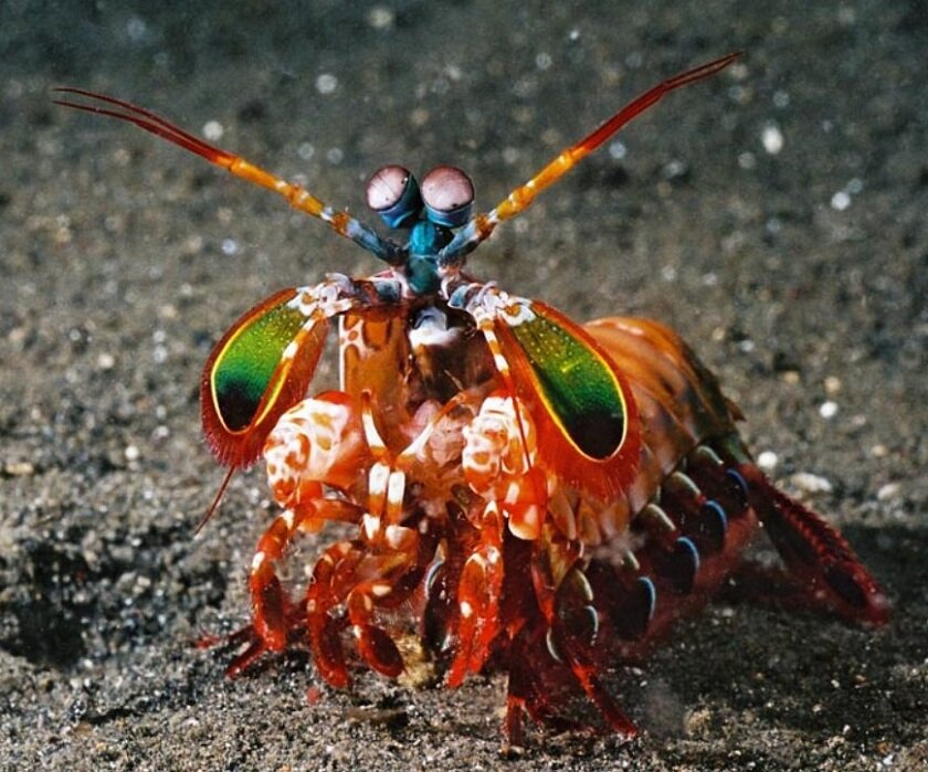 Он умеет нагревать воду до температуры поверхности солнца. Он видит в четыре раза больше цветов, чем человек. Его клешни — два заряженных арбалета с мощностью как у пистолета. Он обитает на дне океана, и именно из-за таких тварей человечеству там нет места. Мы знаем его под именем «рак-богомол», и это — самая поразительная (после человека) тварь, которая водится на нашей планете. Эти чудесные яркие создания - супер хищники. Раки Богомолы охотятся на мелких рыб, креветок, каракатиц и многощетинковых червей. Их передние лапки-клешни на столько быстро и сильно выбрасываются вперед, что способны расколоть самую прочную раковину моллюска или панцирь ракообразных. Скорость с которой рак богомол ударяет по своей жертве своей ногоклешней - 80 км/час, то есть быстрее пули. Менее чем за 3 тысячных секунды рак способен нанести жертве удар с огромной силой, а сила удара может быть свыше 1500 ньютонов, рак-богомол живет в прибрежных морских зонах и его размеры составляют от 2 до 40 см, представьте,