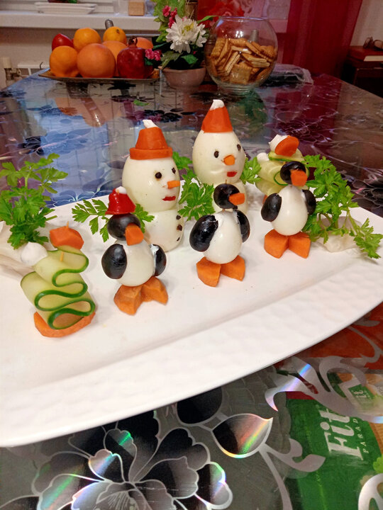Для снеговика отвариваем яйца, срезаем низ и одеваем на зубочистку. Ножом делаем маленькие надрезики для глаз и пуговиц, и вставляем перчик или кусочки оливок. Кончик морковки отрезаем и, как шапочку, одеваем одному. А второму - кружочки морковки. Из кусочка красного перца - ротики и зелень в бока.