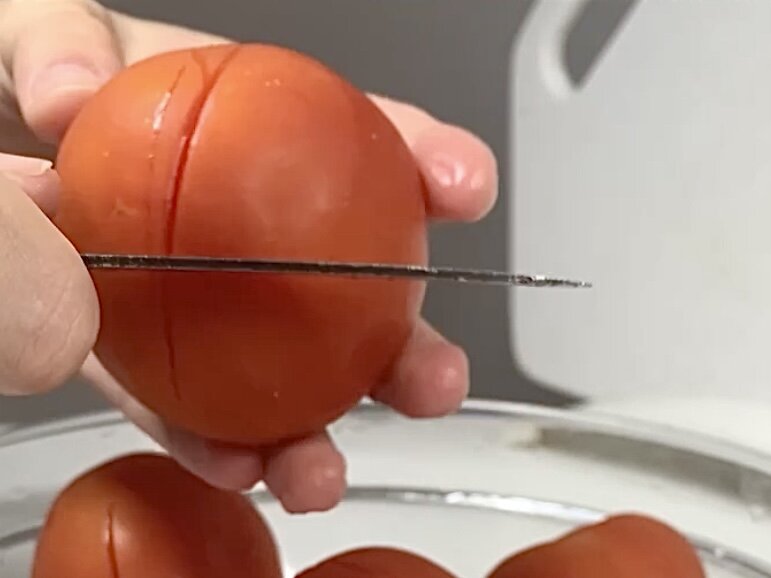 Без преувеличения! Так и есть, пока мужчины жарят шашлык, помидоры улетают на «ура». Больше года назад, я рассказывала, что на моем новогоднем столе не так ждут гости салаты, как эти маринованные помидоры. За пару дней до нового года готовлю первую партию такой закуски, после праздника рассол не выливаю! А готовлю сразу же вторую партию на Рождество в этом же маринаде. Тут главное найти более менее вкусные помидоры, и чтоб цена не сильно кусалась. Но как показал опыт, даже самые стеклянные помидоры получаются очень вкусными, благодаря маринаду. Помидоры (сам рецепт рассчитан на 4 кг помидоров, я делаю на 2 кг, зимой 4 кг дороговато). Делаю неглубокий крестообразный надрез, заливаю кипятком на 1-2 минуты. Затем с легкостью очищаю помидоры от кожицы. Через мясорубку пропускаю красный болгарский перец, острый перец, чеснок. Соединяю всё одной миске, добавляю рубленую петрушку. Всыпаю сахар, соль, вливаю уксус. Хорошо перемешиваю. В кастрюлю выкладываю слоями помидоры и маринад