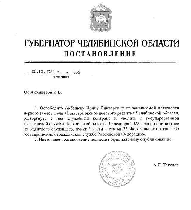 Полномочия Ирины Акбашевой на посту первого заместителя министра экономразвития Челябинской области истекают 30 декабря. Она уходит в отставку по собственному желанию. Постановление о кадровых решениях подписал губернатор Алексей Текслер.