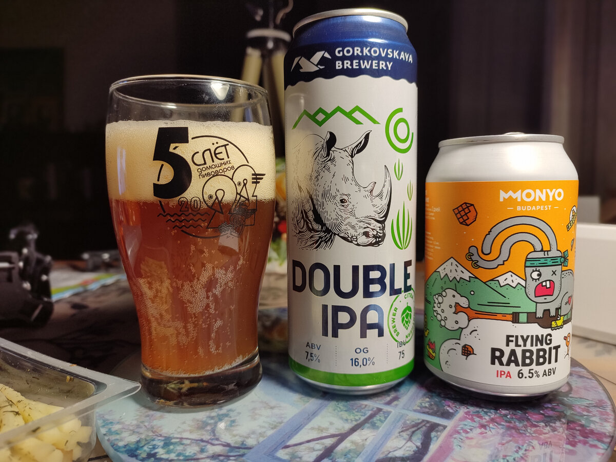 Прочитал статью на канале Пиво Патруль о двойной ипе от Горьковской пивоварни, и так она меня заинтересовала, что решил тоже отведать. Тем более, что в мутных водах тысяч постиков телеграм-чата ВПК мелькала как-то светлая мысль по поводу этого пива, так что - надо. После некоторых поисков по городу - слава Дионисию! - удача, таки нашёл. Ну не одно же брать - надо что-то хотя бы в пару. Помнится, по поводу продукции венгерской пивоварни Monyo доблестные впк-шники устроили такой гвалт, что даже наш добрый друг Александр Иджон соблаговолил обозреть это пиво 6-). А оно тут, на полочке, рядушком - как не взять? Так что вот: И помните: Flying Rabbit, IPA, Monyo, Будапест, Хунгари Аромат мне показался несколько слабоватым. От ипы же ждёшь могучего дыхания кедра, обожравшегося апельсинами, а тут - так, слегка... Более карамелькой какой-то отдаёт. Пена - неоднородная, неплотная, среднестойкая (на фото - она). Вкус - хм... что он мне напомнил?... А! - руипа, точно! Плотный, отчётливо сладкий, с