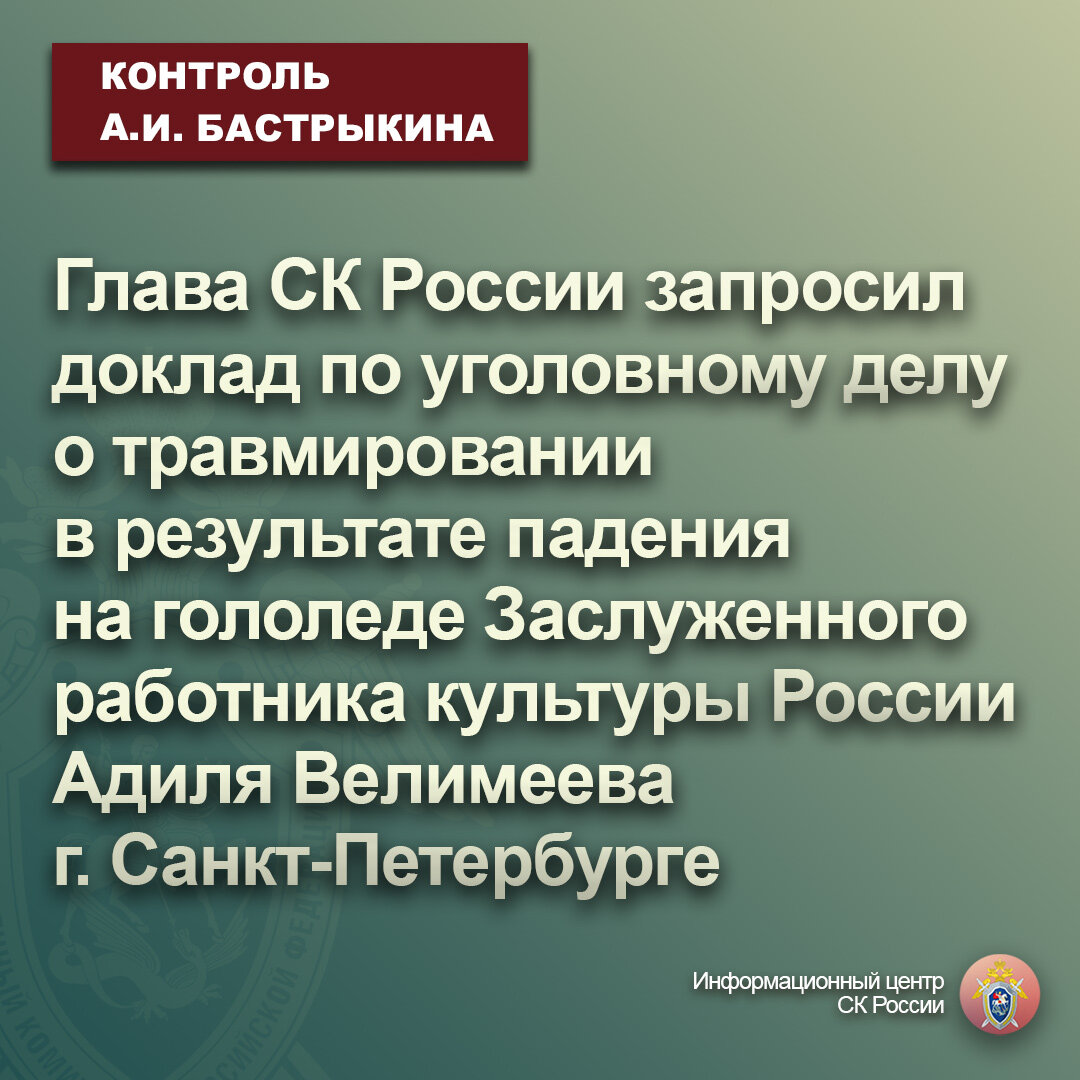 Глава СК России запросил доклад по уголовному делу о травмировании в результате падения на гололеде Заслуженного работника культуры России Адиля Велимеева в г. Санкт-Петербурге