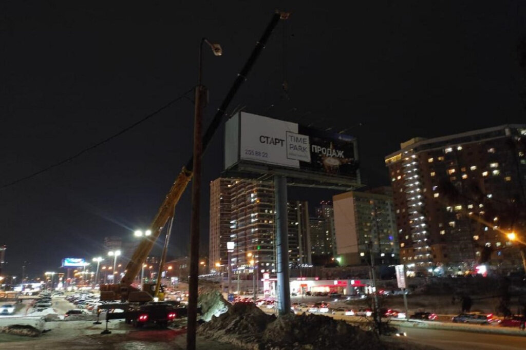 Вчера, 21 декабря, возле двух крупнейших торговых центров Новосибирска убрали три огромных рекламных суперсайта, стоявших на 13-метровых столбах. На прошлой неделе такую же конструкцию демонтировали у ТЦ «Сибирский молл». Лариса Сокольникова Как рассказал «Новосибирским новостям» начальник управления художественного облика города Олег Хорошунов, всего было демонтировано четыре незаконных суперборда размером 5 на 15 метров, размещённых на столбах высотой 13 метров. На прошлой неделе убрали один на площадке возле «Сибирского молла», на этой — два у «Ауры» и один у «Меги». Демонтаж суперсайта возле «Ауры». Фото: управление художественного облика города мэрии города Новосибирска Вчера работы возле ТРЦ «Аура» начались ещё засветло. Возле «Меги» демонтаж вели уже при свете дня. Сначала обе площадки вокруг рекламных конструкций очистили от снега, чтобы технике было удобнее работать. Для демонтажа использовали автокран грузоподъёмностью 80 тонн. Демонтаж суперсайта возле «Меги». Фото: управлен