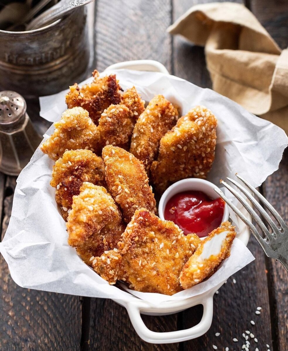 Привет, друзья ! На календаре последние денёчки этого года, и я ничего не успеваю 🤯 Генеральная уборка идёт полным ходом . Дом небольшой, но с детьми это превращается в целый квест )) А как у вас дела ? Сегодня у меня рецепт домашних куриных нагетсов, уверяю - вкуснее вы ещё не ели ! ИНГРЕДИЕНТЫ : Куриное филе - 2 штуки, Яйцо - 2 штуки, Мука, панировочные сухари, кунжутные семечки - для панировки, Соль, чёрный молотый перец (или смесь перцев), паприка, приправа для курицы - по вкусу, Растительное масло - для жарки . ПРИГОТОВЛЕНИЕ : 1) Куриное филе нарезаем небольшими кусочками, примерно 1 см толщиной . 2) В миске смешиваем все специи и соль . Кладём туда филе, хорошо перемешиваем и оставляем минут на 20 . 3) Яйца взбить до однородности . Смешать сухари и кунжутные семечки . 4) В сковороду наливаем растительное масло и хорошенько нагреваем . 5) Каждый кусочек филе мы окунаем в яичную смесь, затем в муку, затем опять в яичную смесь и в па