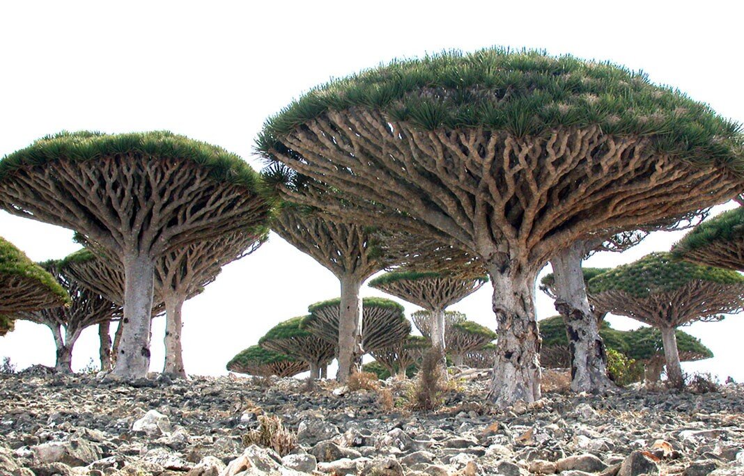 Остров Сокотра в Аравийском море уникален своим биологическим разнообразием и эндемичными видами. Одним из самых ярких примеров является дерево Драконьей крови с его мистической, подобной зонтику формой и красной смолой, которая, по легенде, была кровью драконов. Источник: https://planetone.ru/zemli/