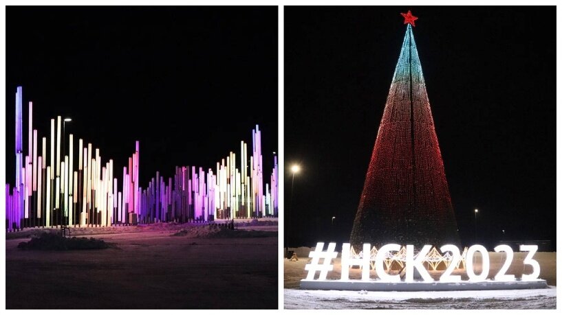 На кадрах видно, что рекреационную зону украсили иллюминацией. В парке установили цифровую ёлку и светящийся шатёр.