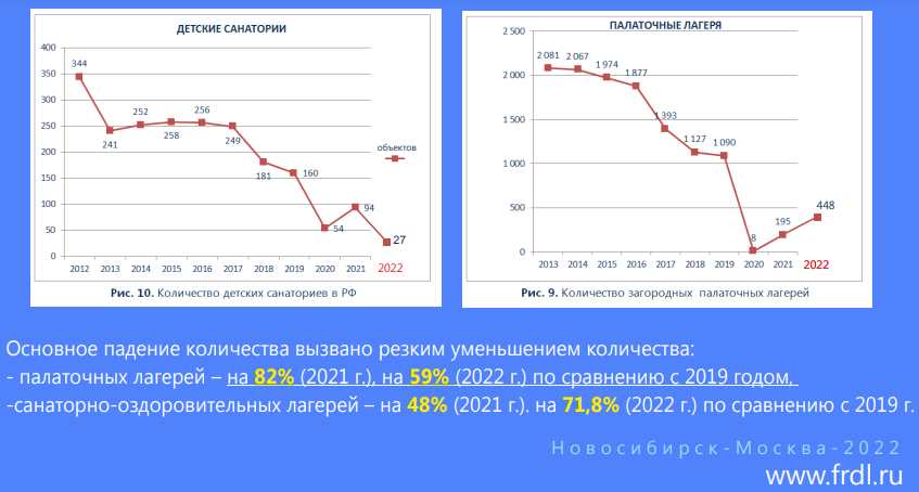 Повторяю: "Андрей и Наталия Данилковы провели ОЧЕНЬ качественное и глубокое исследование по проблемам детских лагерей, и я некоторые полученные ими данные буду постепенно выкладывать здесь. И предлагаю всем заинтересованным подписаться на их канал: t.me/frdl_2015" Здесь - про палаточные лагеря и санаторно-оздоровительные лагеря. Меня по старой памяти волнуют именно палаточные лагеря, и вот: в 2022 году их было проведено 448. В 2019- 1090. Ну и, на всякий случай, напомню, что "В 2009 году в России организовывалось 7 тысяч палаточных лагерей" .https://ria.ru/20120924/226836620.html Хотя, можно посмотреть и с другой стороны, АПТИМИСТИЧНА, вот так, например: https://www.mskagency.ru/materials/3216175 Количество палаточных лагерей для детей в России выросло в два раза по сравнению с 2021 годом. Об этом сообщил директор департамента надзорной деятельности и профилактической работы МЧС России Ринат Еникеев в ходе пресс-конференции. «Особую популярность приобретают лагеря палаточного типа,