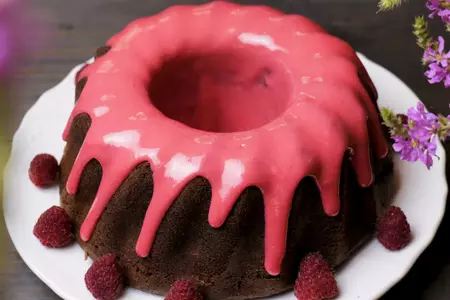 «Хотите отведать очень вкусный кекс? Сегодня Мы расскажем как же его приготовить и вы сможете удивить своих близких этим красивым блюдом!». Ингредиенты Пошаговый рецепт приготовления Взбейте яйца с сахаром до пышной белой массы. Добавьте просеянную муку, какао, разрыхлитель, масло подсолнечное, растопленное сливочное масло, коньяк, взбейте на низких оборотах миксера до однородности или перемешайте лопаткой. Смажьте форму сливочным маслом (моя форма 20 на 9) Налейте форму 1/4 часть теста сверху положите ягоды малины на расстоянии в 3 см, со стальным тестом и малиной поступите также, наливайте тесто частями, выкладывайте малину. Поставьте выпекаться кекс в заранее разогретую духовку до 180° на 30-35 минут готовность проверяйте деревянной шпажкой. Охладите готовый кекс до полного остывания в форме. Глазурь, протрите малину через сито, добавляйте по одной ложке малиновый сок в пудру до нужной консистенции. Полейте глазурью полностью остывший кекс, кекс можно кушать сразу, но лучше дать ем
