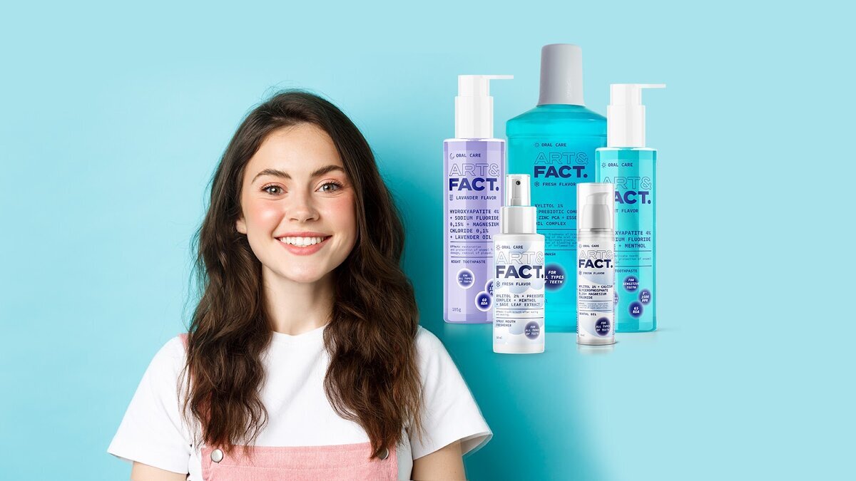С проблемами полости рта сталкивается каждый второй житель нашей планеты. Хорошая новость в том, что большинство из нас может не допустить или замедлить их развитие с помощью правильной гигиены. Команда Art&Fact, опираясь на опыт стоматологов и современные научные факты, разработала линейку по уходу за зубами и полостью рта — Oral Care. В нее вошли все необходимые средства для качественного и эффективного домашнего ухода. Ниже расскажем, как правильно его выстроить. Выделим три основных этапа. Этап №1. Очищение Перед чисткой зубов рекомендуется удалять остатки пищи специальной нитью или ирригатором, а также пройтись монопучковой щеткой для проработки труднодоступных мест. Чистите зубы два раза в день — утром и вечером после еды. Для этого отлично подойдут зубные пасты Art&Fact. Дневная отбеливающая для нормальных и чувствительных зубов с гидроксиапатитом кальция, фтором и ментолом эффективно удаляет налет, отбеливает и полирует эмаль за счет среднего индекса абразивности. Ночная ремине