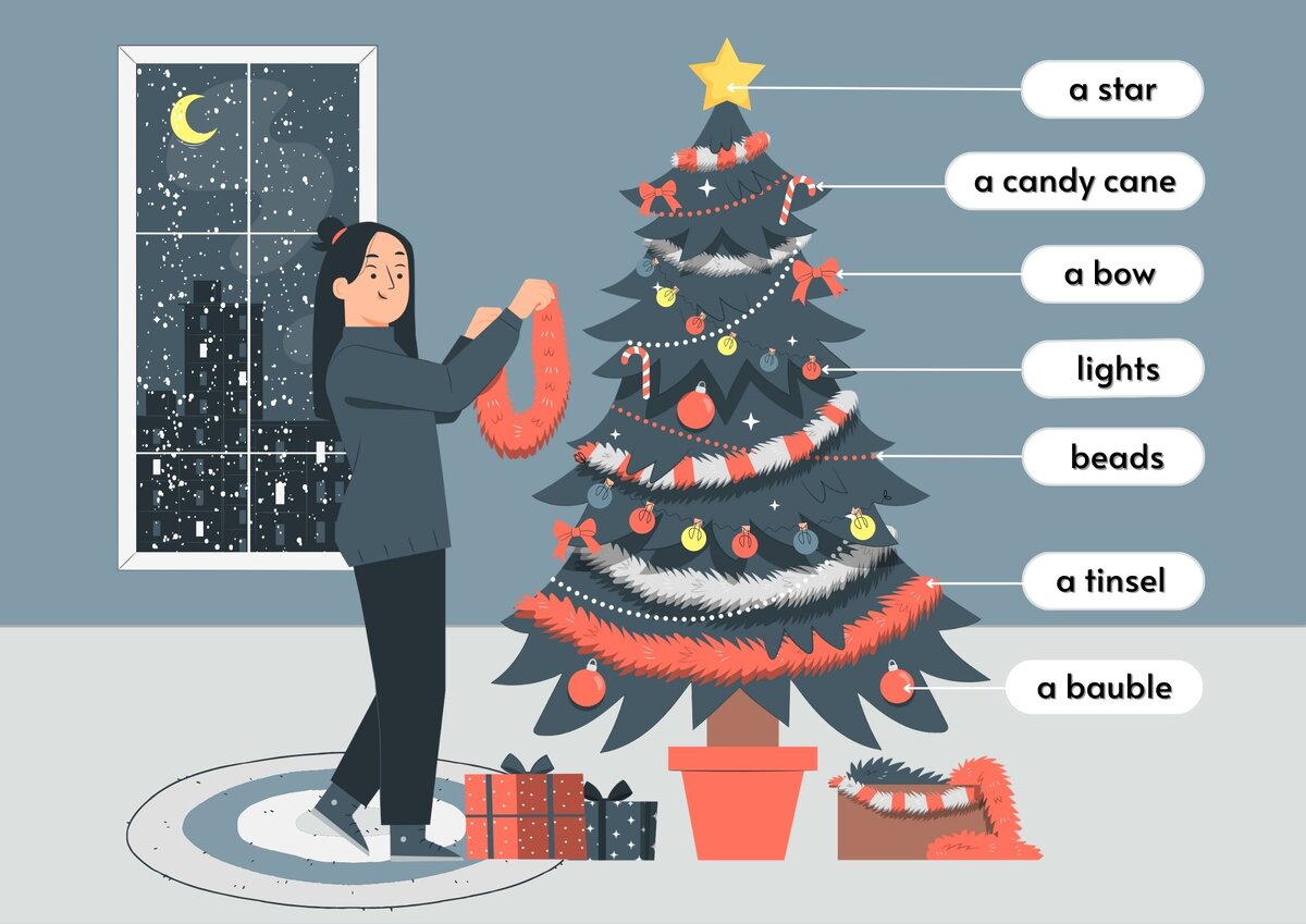 Новогодняя ёлка — главный атрибут Нового года и Рождества. Каждый год около неё происходят чудеса, собираются родные и близкие, и конечно же, находятся подарки. English stuff подготовил список полезных слов и фраз по теме "Let's decorate the Christmas tree!". Christmas trees: • a real tree — живая ёлка • an artificial tree — искусственная ёлка • a pre-lit Christmas tree — искусственная ёлка cо встроенной гирляндой Phrases: • to fluff an artificial tree — распушить искусственную елку • to shape branches — придать форму ветвям • to deck/deck out — украшать Ornaments & Decorations: • ornaments — ёлочные игрушки • a bauble — ёлочный шар • a tree topper — верхушка на ёлку • a bow — бант • beads — бусы • a bell — колокольчик • a candy cane — леденец в форме тросточки • a tinsel — мишура • a ribbon — лента • a garland — гирлянда (украшение из соединённых между собой цветов, фруктов, лампочек, мишуры) • Christmas lights — гирлянда (с огоньками) • a tree skirt — юбка/коврик под ёлку Phrases: •