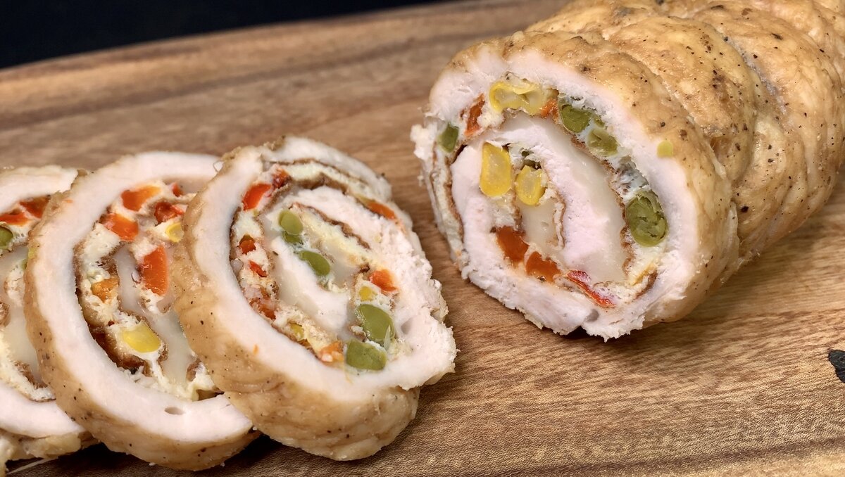 Такую закуску из курицы я готовлю и подаю даже на праздничный стол! Выглядит эффектно, делать просто и получается очень вкусно! Вы только посмотрите, как красиво закуска смотрится в разрезе! Куриный рулет - это всегда удачная идея не только для праздника, но и на любой другой случай! Я подаю и к празднику, как нарезочку, и, на каждый день, как альтернативу колбасе на бутербродах. Список ингредиентов и пропорции я оставлю в закреплённом комментарии под статьёй. Готовьте и пробуйте с удовольствием! Способ приготовления: