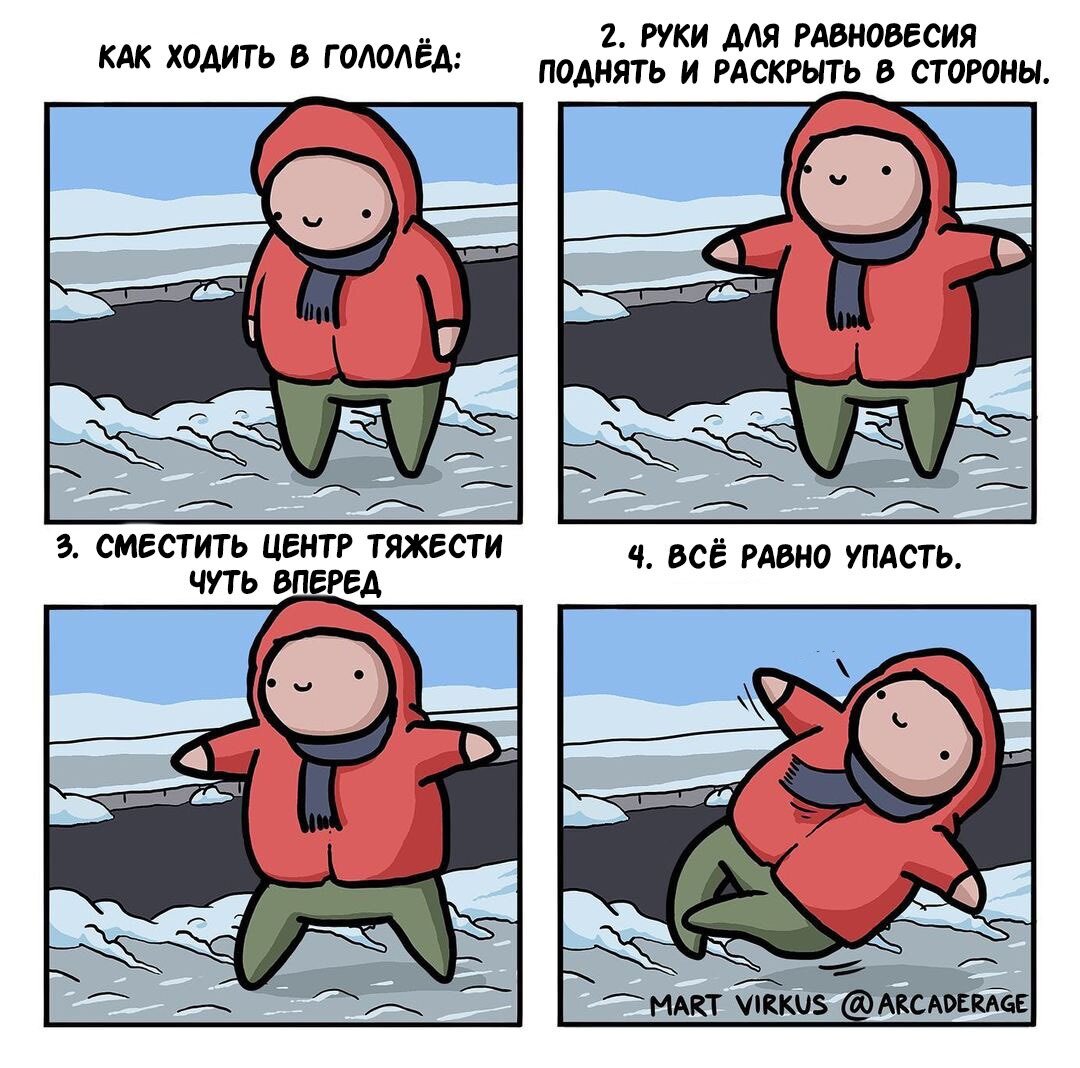 Привет, дорогой друг! Наступила зима, и по традиции, в наших городах открылись самые большие катки, которых нет и в Европе! Фаворит - естественно, в Петербурге. Прямо на улицах города!) Да, к сожалению, снегопад и морозец часто сопровождаются сосулями, снежными заносами и невероятным гололедом. Но почему-то этим «радости» зимы не принято выставлять в соцсетях. Ведь, куда красивее кружить в сторис, ловя ртом снежинки, чем показывать, как вы «вальсируете» на тротуаре, стараясь удержать равновесие. Я решил исправить эту несправедливость! Поэтому сегодняшняя подборка комиксов посвящена именно им – «негодяям», которые портят нам зимние прогулки. Если вас еще не замело в большой сугроб или вы не упали на свою пятую точку, скорее читайте сегодняшнюю статью – готовьтесь к тому, что вас ожидает) Ведь впереди еще два зимних месяца. Все мы когда-то хотели почувствовать себя вольными птицами. Хорошо, что зимой у нас есть такая возможность. Ведь в гололед все выглядят, как пингвины. Комикс от Март