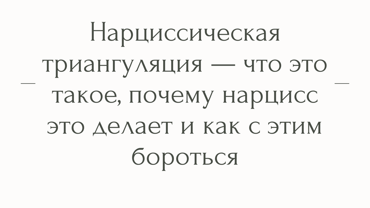 Нарциссическая триангуляция — обычная тактика, используемая нарциссом для сохранения своей власти и контроля в отношениях. Это может включать использование друзей, членов семьи или даже незнакомцев в качестве пешек, чтобы выиграть спор или укрепить свое чувство превосходства. Нарцисс попытается превратить конфликт между собой и своей жертвой в конфликт между собой и союзником против своей жертвы. Столкнувшись с ситуацией «двое против одного», жертва, скорее всего, отступит. Тактика нарциссической триангуляции Как нарцисс будет использовать триангуляцию в романтических отношениях В романтических отношениях наиболее распространенная форма триангуляции — это когда нарцисс вводит в смесь третью сторону, создавая психологический «тройничок». В начале отношений он будет делать это таким образом, чтобы новый ресурс почувствовал себя ценным. Он может рассказывать грустные истории о том, какой ужасной была его бывшая/бывший, или комментировать, например насколько лучше готовит его новая возлюбл