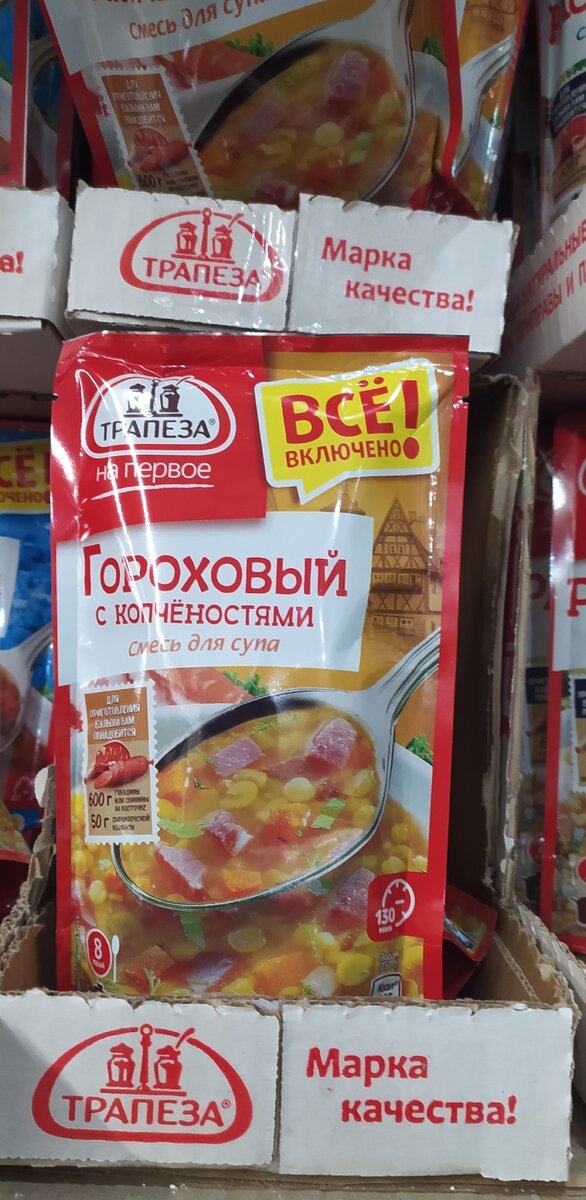 Здравствуйте, дорогие друзья! Добро пожаловать на канал Михайловна! Сегодня предлагаю сделать перерыв и не посещать магазин Фикс Прайс, а заглянуть в магазин Светофор. Редко, но метко наведываюсь туда. Хочу показать вам, что нашла там интересного, какие новинки Светофор выставил в торговый зал и простые недорогие бытовые нужности посмотрим. Присоединяйтесь, обзор товаров в магазине Светофор начинается! Начать хочу с полуфабрикатов от торговой марки Трапеза на первое. Смесь для супа "Трапеза на первое", 130 гр., цена 54 руб. По утверждению производителей одного пакетика сухой смеси хватает на 2 с лишним литра супа. Разные вкусы. В прошлом году я уже покупала смесь для приготовления борща и делала обзор. Кто не помнит - видео выложу в конце этой статьи. Сушки "Малышка" простая, 0.5 кг, цена 37 руб. 50 коп. Постоянно покупаю. Вкусные тоненькие хрустящие сушки. Арахис в жженом сахаре 0.5кг, цена 110 руб. 70 коп. Щербет с арахисом 500 гр, цена 109 руб. 22 коп. Шоколад темный со сливоч