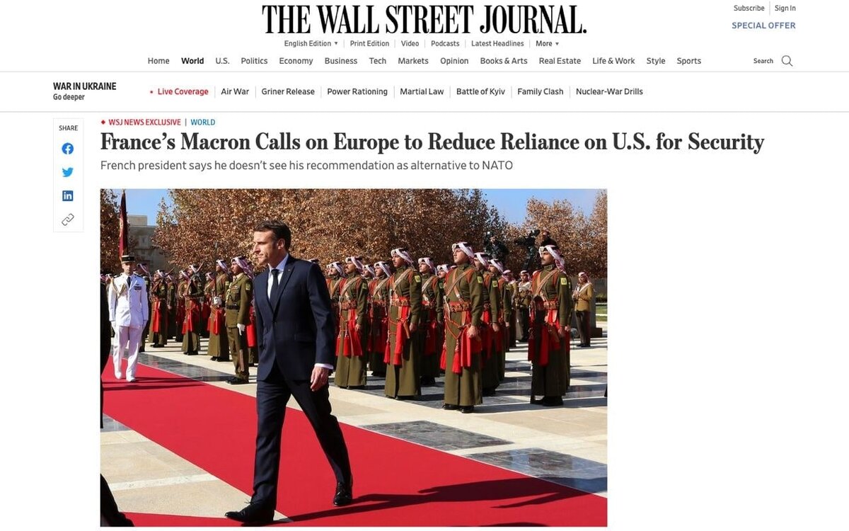 Президент Франции Эммануэль Макрон призвал Европу не полагаться на США в вопросах безопасности, а также дать России все гарантии безопасности в рамках переговоров о прекращении боевых действий на Украине, говорится в статье.