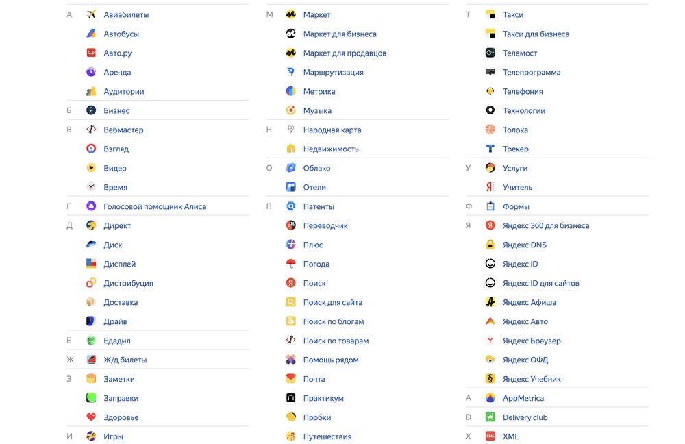 К текущему моменту «Яндекс» насчитывает около сотни сервисов для пользователей и бизнеса, и примерно у половины из них есть собственные приложения. Некоторая часть из них поместилась на скрине.