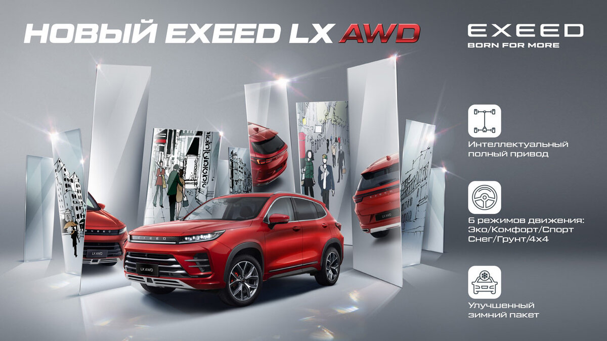 Ключевой особенностью EXEED LX AWD является появление полного привода, который превращает новинку не только в городского героя, но и в уверенного партнера на загородных дорогах, удивляя комфортом на внедорожных участках.