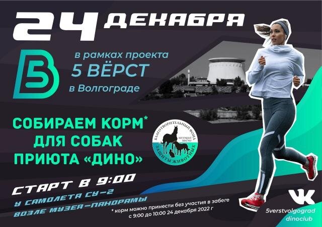 В Волгограде в эту субботу, 24 декабря, пройдёт акция по сбору корма для собак. Сделать новогодний подарок четвероногим питомцам приюта «ДИНО», может любой желающий. Сегодня в приюте живут 300 собак, два львёнка, зелёная мартышка и лисы. И содержат всех этих питомцев благодаря пожертвованиям. Поучаствовать в помощи приюту может каждый волгоградец. Акция пройдёт у самолета СУ-2 возле музея-панорамы Сталинградская битва - на еженедельной пробежке в рамках проекта «5 Вёрст». С собой нужно принести корм для собак, а при желании пробежать или пройти пешком с четвероногими питомцами дистанцию 5 км. Кстати, все участники пробежки получат сувениры от партнеров акции.
