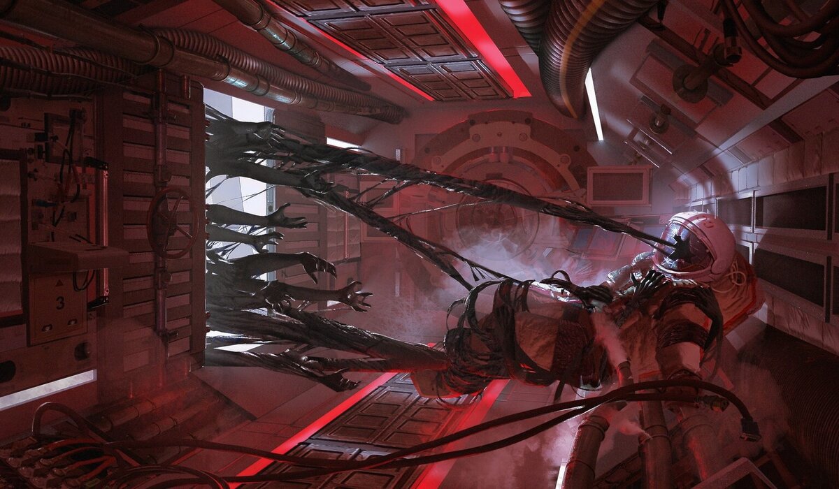 Санитары и доктора, испугавшись, попытались спрятаться по углам, но трубки – как живые и разумные существа – выследили и настигли каждого. Они присасывались к лицам и выкачивали жизненную энергию. Отлепившись, трубки оставляли на лицах кусты своих маленьких копий. Некоторые трубки яростно отрывали лица жертв, и в кровавом месиве кусты росли только быстрее. Во все стороны разлетались кровавые ошмётки, а белые прутики уже тянулись к двери. По стенам скользнула рябь, а дверь затрясло. По коридорам космической станции волнами полились кричащие звуки сигнала тревоги.