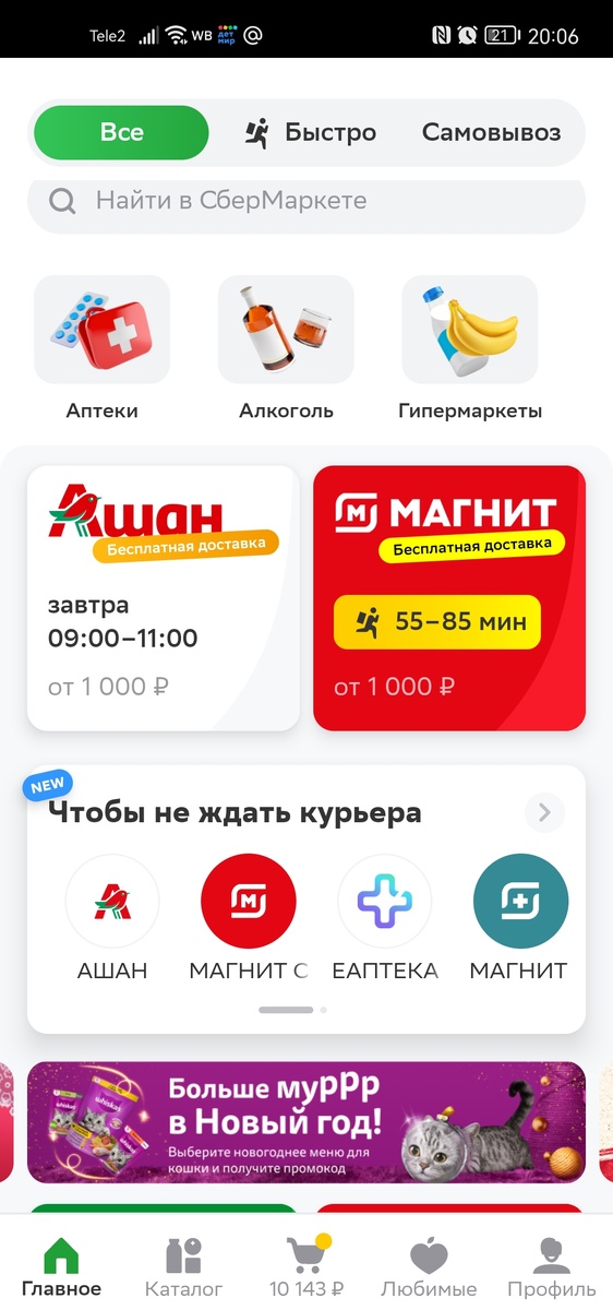 СберМаркет-это доставка и самовывоз. Можно заказать доставку из семейного магнита, магнита экстра, магнит косметик, сбераптека, пятерочка, правильная корзинка, ашан. Ещё есть лента, самокат и другие, но их в нашем городе нет. Доставка и сборка бывают бесплатными, бывают по акции. Заказываю вещи и продукты. Если продукты не соответствуют качеству, нужно позвонить в поддержку, деньги вернут на карту или в виде купона на следующую покупку. Ходила специально а магазин чтобы сравнить цены, это небо и земля. Вы где нибудь видели товары по таким ценам? И это не окончательная цена. Самас частая скидка 400р от 2000руб.Люблю покупать здесь косметику loreal, выходит в 3 раза дешевле, у меня огромная коллекция туши и помад. Обожаю электрическую щётку, насадки здесь по самой привлекательной цене. Колготки-это песня. Набрала впрок себе и дочери от 40 до 360 дэн. Духи хожу затестить в ближайший магазин, потом заказываю с доставкой на дом. Например, amor amor нигде по такой цене нет, не забудьте